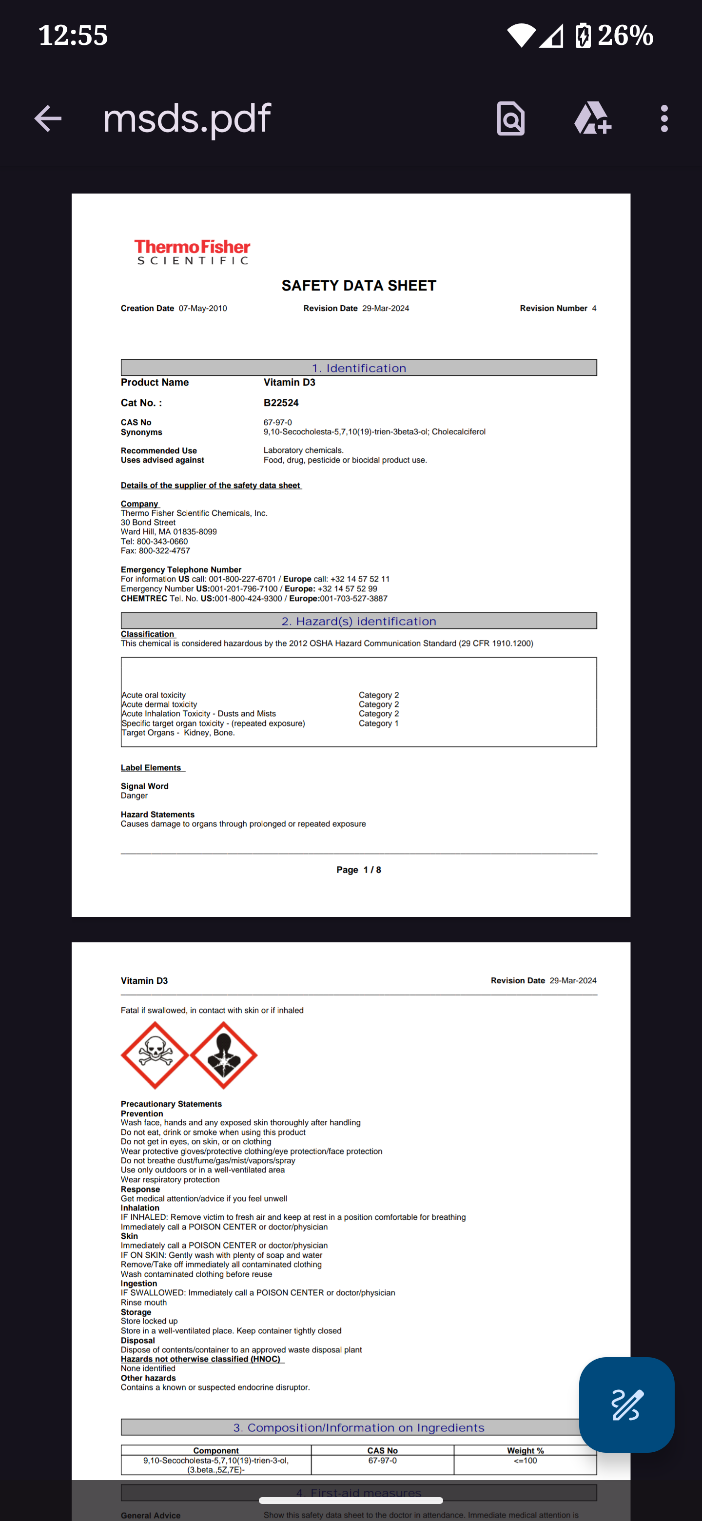 Now we get to the astonishing claim cholecalciferol contains chloroform. I followed the link to the MSDS identified in this article. It's from ThermoFisher Scientific.